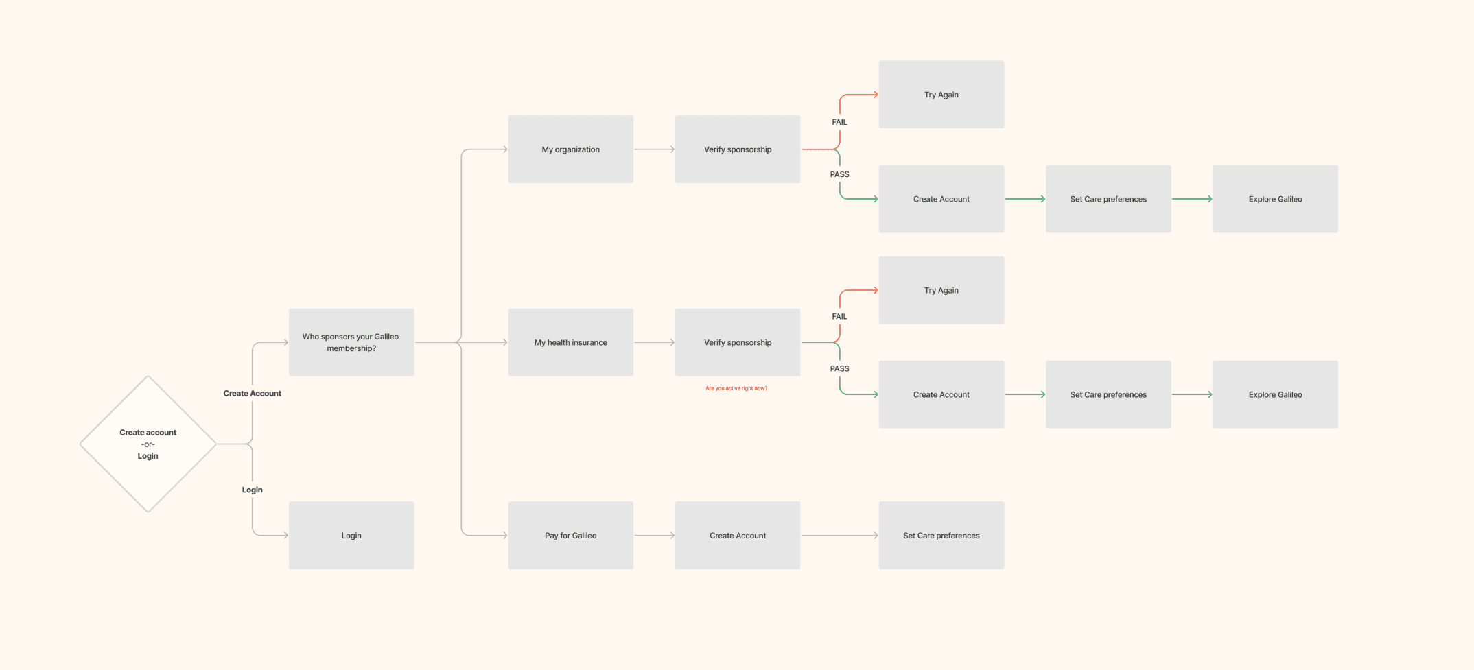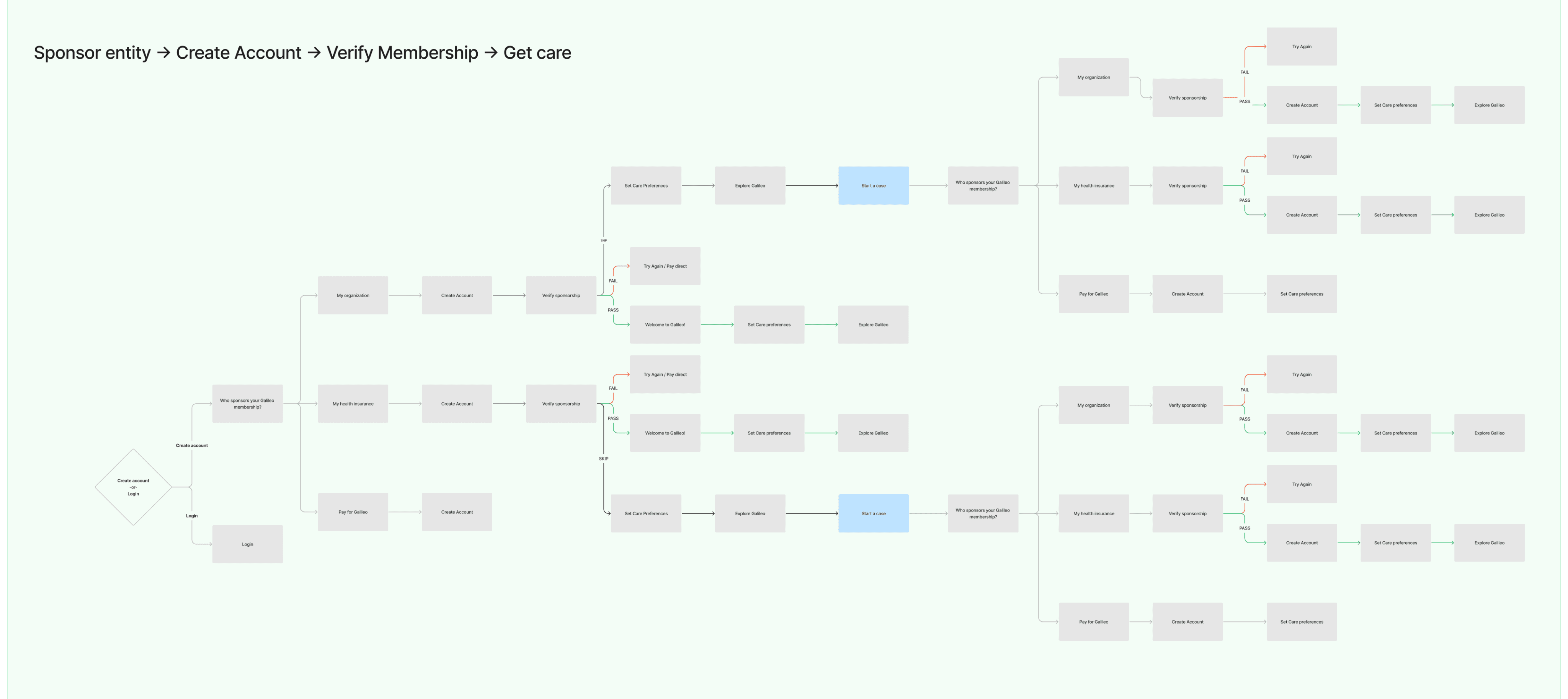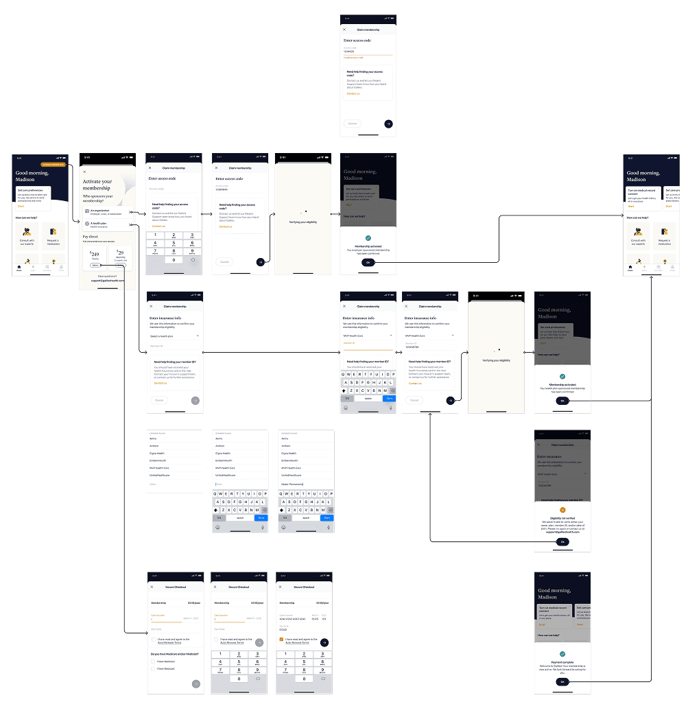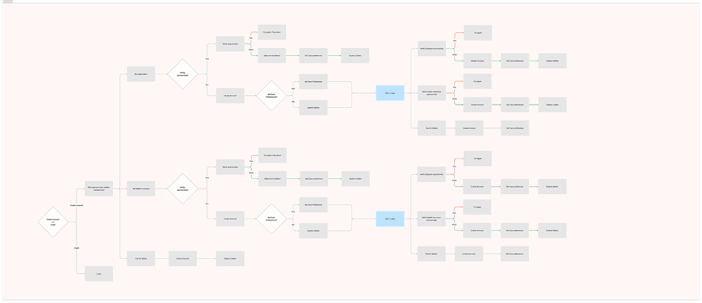 I mapped several alternative onboarding flows, each testing a different sequence for employer‑sponsored, payer‑sponsored, and direct‑to‑consumer patients. In every scenario, D2C served as the default path for non‑sponsored users. These diagrams were strictly exploratory and do not yet reflect every category detail discussed above; their purpose was to pressure‑test options for opening the registration and care‑access funnel.