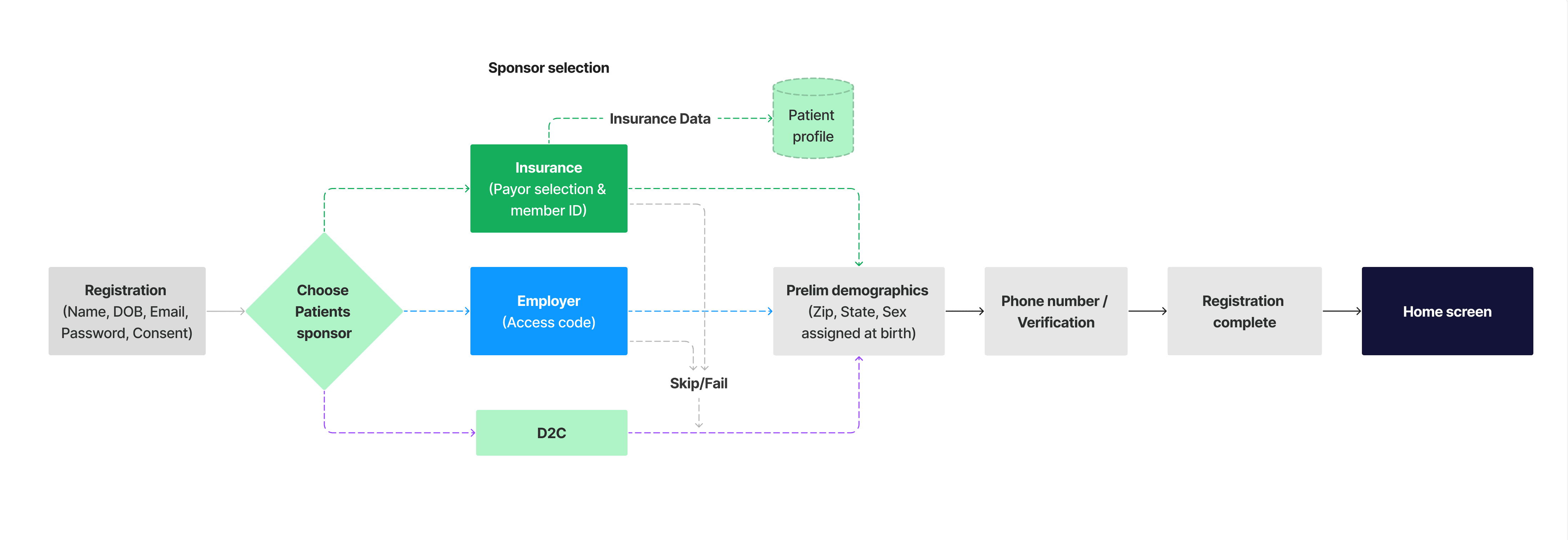 - Uses D2C as the universal fallback: any skip, failure, or ineligible sponsor gracefully routes to the self‑pay path rather than ejecting the user.
